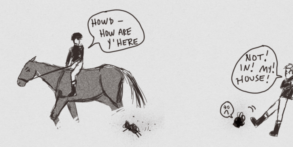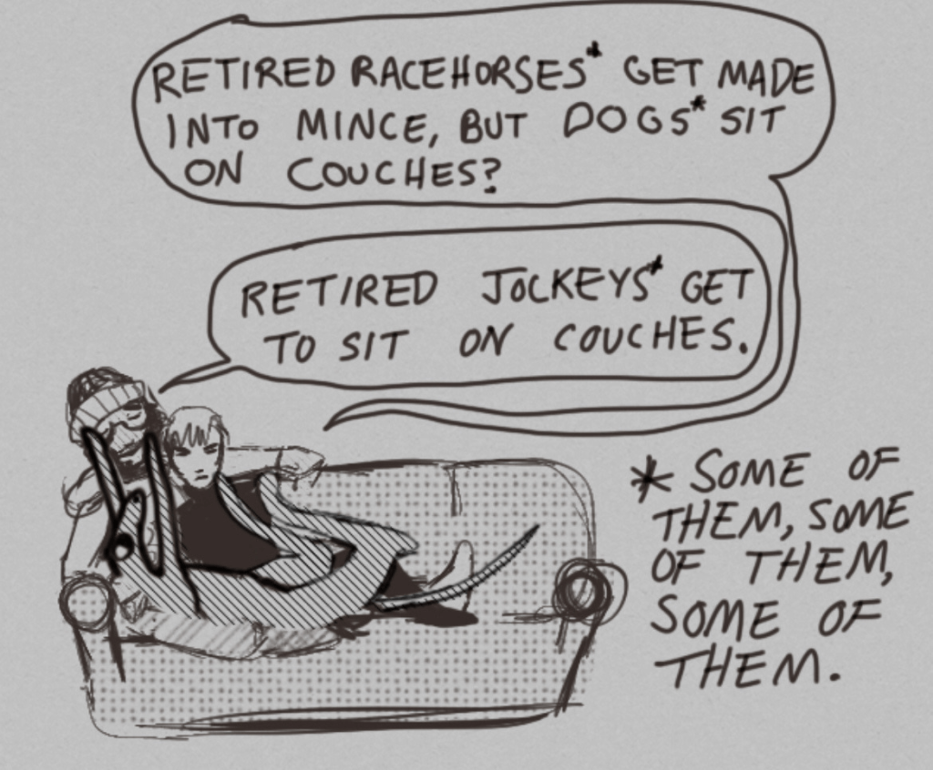 He’s a small, angry, and entirely fictional racehorse jockey with an unfortunate psychic connection to his rancid racehorse frenemy (O Holy Thunder), a redemption-arc relationship with his nice nerdy boyfriend (Derek), an elusive twin brother (Charlie) and a messy, rambling family of horse-obsessed weirdos who are overly-invested in the fascinating, complex, dirty, problematic and unhinged world of horse racing.